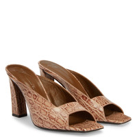Product Details Minimalist open-toe mule sandals in crocodile-print leather with square toe and topline and block heel with metal detail. - Pink crocodile-print leather and pink leather details - Metallic detailing on light golden heel - Heel height: 90 mm - Heel covered in pink crocodile-print leather - Brown leather sole with logo ORIGIN: ITALY COLOR: PINK
