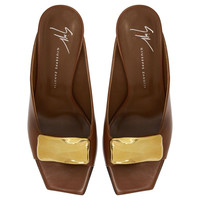 Product Details Clean-cut, open-toe mule sandals in leather with square toe and topline, geometric metal brooch and block heel. - Light brown leather - Golden metal accessory - 90 mm-high heel. - Brown leather sole with logo ORIGIN: ITALY COLOR: BROWN