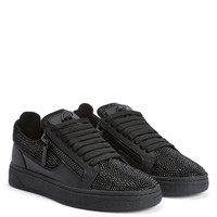 Product Details Low-top lace-up sneakers in leather and suede-effect fabric with rhinestone embroidery, two tonal side zips and rubber sole. - Men's sneakers - Suede-effect black synthetic fabric and leather - All-over black rhinestones embroidery on the upper - Black lacquered metal 'Signature' hardware - Black cotton laces - Black rubber sole with logo ORIGIN: ITALY COLOR: BLACK