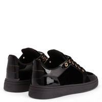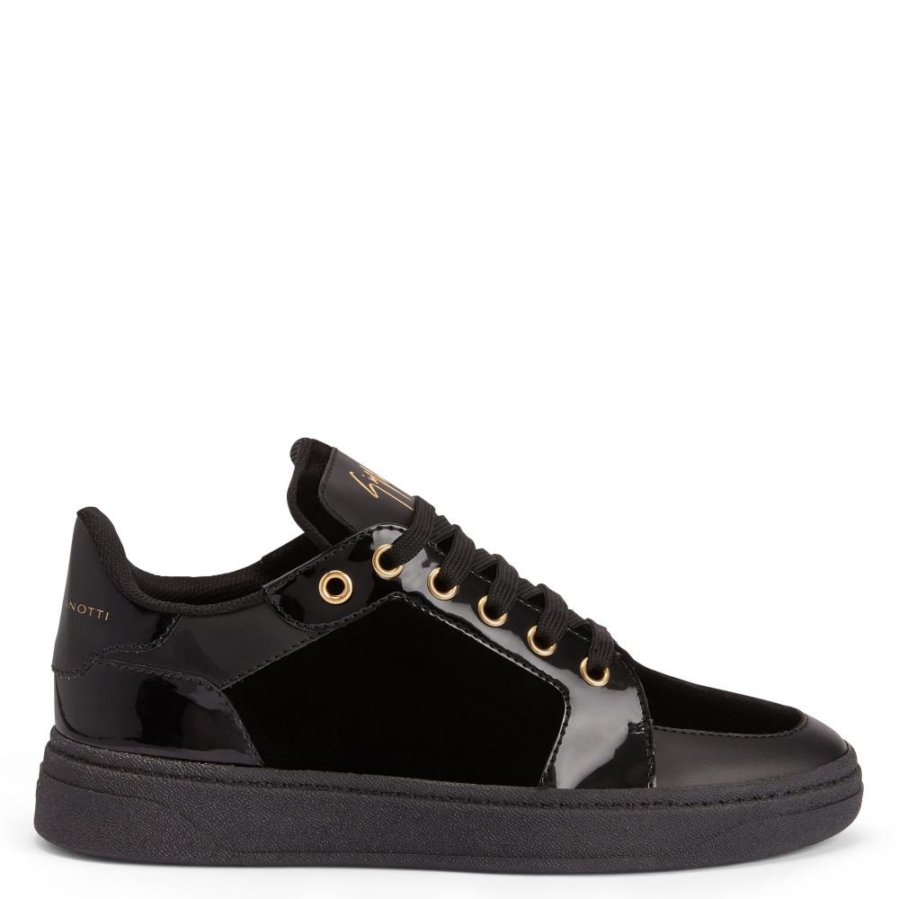 Product Details Low-top lace-up sneakers in leather, velvet and patent-effect fabric with rubber sole. - Men's sneakers - Black leather and patent-effect synthetic fabric and velvet-effect black synthetic fabric - Golden hot-stamped 'Signature' on label - Golden 'Logo Lettering' print on the back - Black cotton laces and golden metal eyelets - Black rubber sole with logo ORIGIN: ITALY COLOR: BLACK