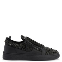 Product Details Low-top lace-up sneakers in suede-effect fabric with bead and rhinestone embroidery, two tonal side zips and rubber sole. - Men's sneakers - Black leather and suede-effect fabric - Embroidery with black beads and black and crystal-coloured rhinestones - High frequency-processed Signature on the label - Black lacing - Black rubber sole with logo ORIGIN: ITALY COLOR: BLACK