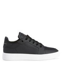 Product Details Low-top lace-up sneakers in leather with rubber sole. - Men's sneakers - Black leather - Golden hot-stamped 'Signature' on label - Golden 'Logo Lettering' print on the back - Black cotton laces and matching lacquered eyelets on the upper - White rubber sole with logo ORIGIN: ITALY COLOR: BLACK