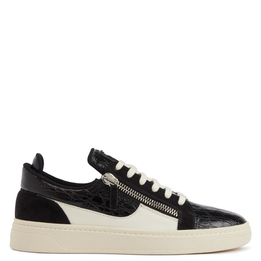 Product Details Low-top lace-up sneakers in crocodile-print leather and suede leather with contrasting leather detail, two side zippers and rubber sole. - Mens sneakers - Black suede leather and crocodile-print leather and white leather upper detail - Black PVC Signature label - Off-white lacing with black and silver-colored metal accessory - Silver-colored metal zipper detail - Off-white rubber sole with logo ORIGIN: ITALY COLOR: BLACK