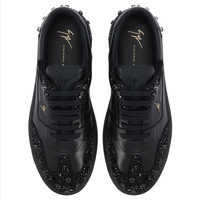 Product Details Low-top suede and leather sneakers with cotton laces, gold-colored logo lettering printed on the heel, bead and rhinestone embroidery, and tone-on-tone rubber sole. - Upper: 40% goatskin suede, 60% calfskin - Lining: 100% polyamide - Insole: calfskin - Sole: Rubber ORIGIN: ITALY COLOR: BLACK