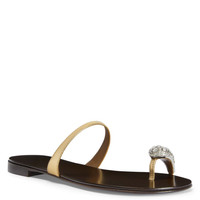 Product Details Giuseppe Zanotti celebrates its thirtieth birthday with an exclusive capsule collection embodying timeless elegance. A capsule born from the union between high-jewellery mastery and fine Italian craftsmanship. Flat thong sandals in leather with rhinestone ring accessory. - Laminated golden leather - Silver metal accessory and crystal-coloured rhinestones - 10mm-high heel - Glossy brown leather sole with logo ORIGIN: ITALY COLOR: GOLD