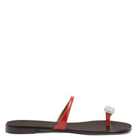 Product Details Giuseppe Zanotti celebrates its thirtieth birthday with an exclusive capsule collection embodying timeless elegance. A capsule born from the union between high-jewellery mastery and fine Italian craftsmanship. Flat thong sandals in leather with rhinestone ring accessory. - Red leather - Silver metal accessory and crystal-coloured rhinestones - 10mm-high heel - Glossy brown leather sole with logo ORIGIN: ITALY COLOR: RED