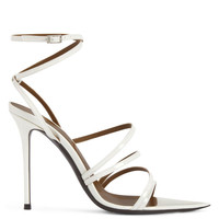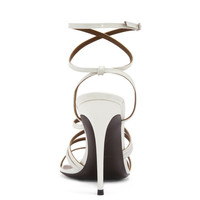 Product Details Pointed-toe sandals in patent leather with thin straps, ankle strap and stiletto heel. - Off-white patent leather - Ankle strap with silver-coloured metal buckle - 105 mm-high heel. - Brown leather sole with logo ORIGIN: ITALY COLOR: WHITE