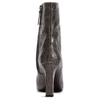 Product Details Ankle boots in crocodile-print leather with elongated square toe, inner zipper to help put them on and metal stitch detail on the heel. - Gray crocodile-print leather - Black inner side zipper and gold-colored metal detail on the heel - Heel height: 90 mm. - Brown leather sole and black non-slip rubber with logo ORIGIN: ITALY COLOR: GREY
