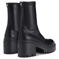 Product Details Leather-effect stretch fabric combat boots with stud detail at the back and one-piece sole. - Black leather-effect synthetic stretch fabric and black patent leather toe cap and details - Gunmetal grey metal stud detail - Heel height: 70 mm - One-piece black rubber sole with logo ORIGIN: ITALY COLOR: BLACK