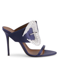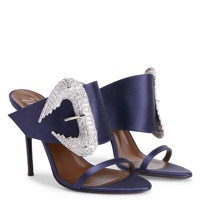 Product Details Satin mules with a large embellished crystal buckle and stiletto heel. - Blue synthetic satin fabric - Large silver metal buckle detail with crystal-colored rhinestones - 105 mm heel - Heel covered in blue synthetic satin fabric - Brown leather sole with logo ORIGIN: ITALY COLOR: BLUE