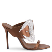 Product Details Satin mules with a large embellished crystal buckle and stiletto heel. - Synthetic satin fabric in chocolate brown - Large silver metal buckle detail with crystal-colored rhinestones - 105 mm heel - Heel covered in synthetic chocolate-brown satin - Brown leather sole with logo ORIGIN: ITALY COLOR: BROWN