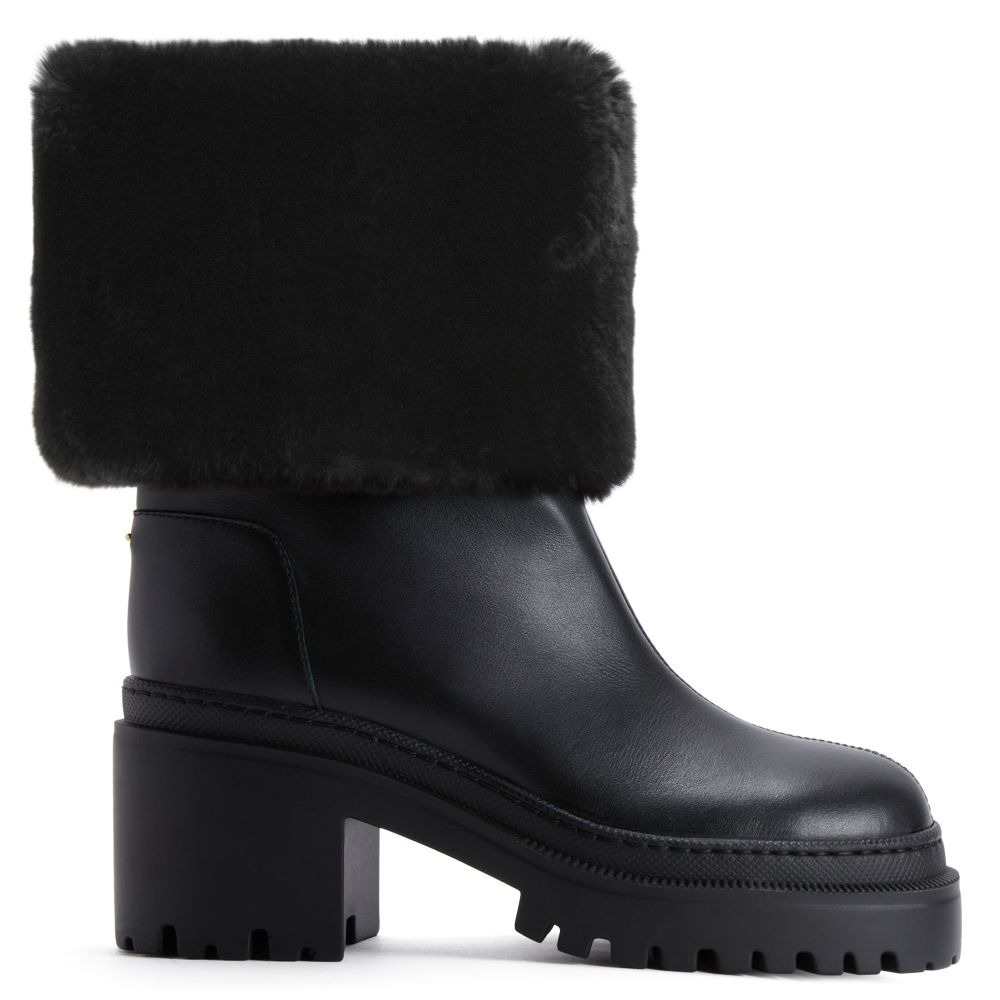Product Details Leather ankle boots with fur cuff and rubber lug sole. - Upper: 80% calfskin, 20% - Lining: 80% wool - 20% NY - Insole: 80% wool - 20% NY - Sole: Rubber ORIGIN: ITALY COLOR: BLACK