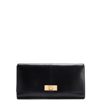 Product Details Leather clutch bag with stitching in the middle, custom central fastening, chain shoulder strap and inner card slots. - Black leather - Rigid golden metal nut-shaped turn lock closure - Golden metal shoulder strap - Black fabric inner lining with card slots - Size: 330 mm x 180 mm x 35 mm ORIGIN: ITALY COLOR: BLACK