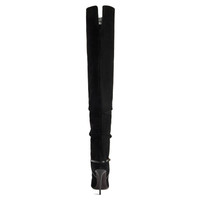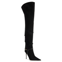 Product Details Above-the-knee-length suede boots with tapered toe, delicate pleating, patent strap, golden-finish buckle and leather-covered stiletto heel. - Upper: 95% goatskin suede, 5% lambskin - Lining: woven leather - Insole: goatskin - Sole: leather - Heel height: 105mm ORIGIN: ITALY COLOR: BLACK