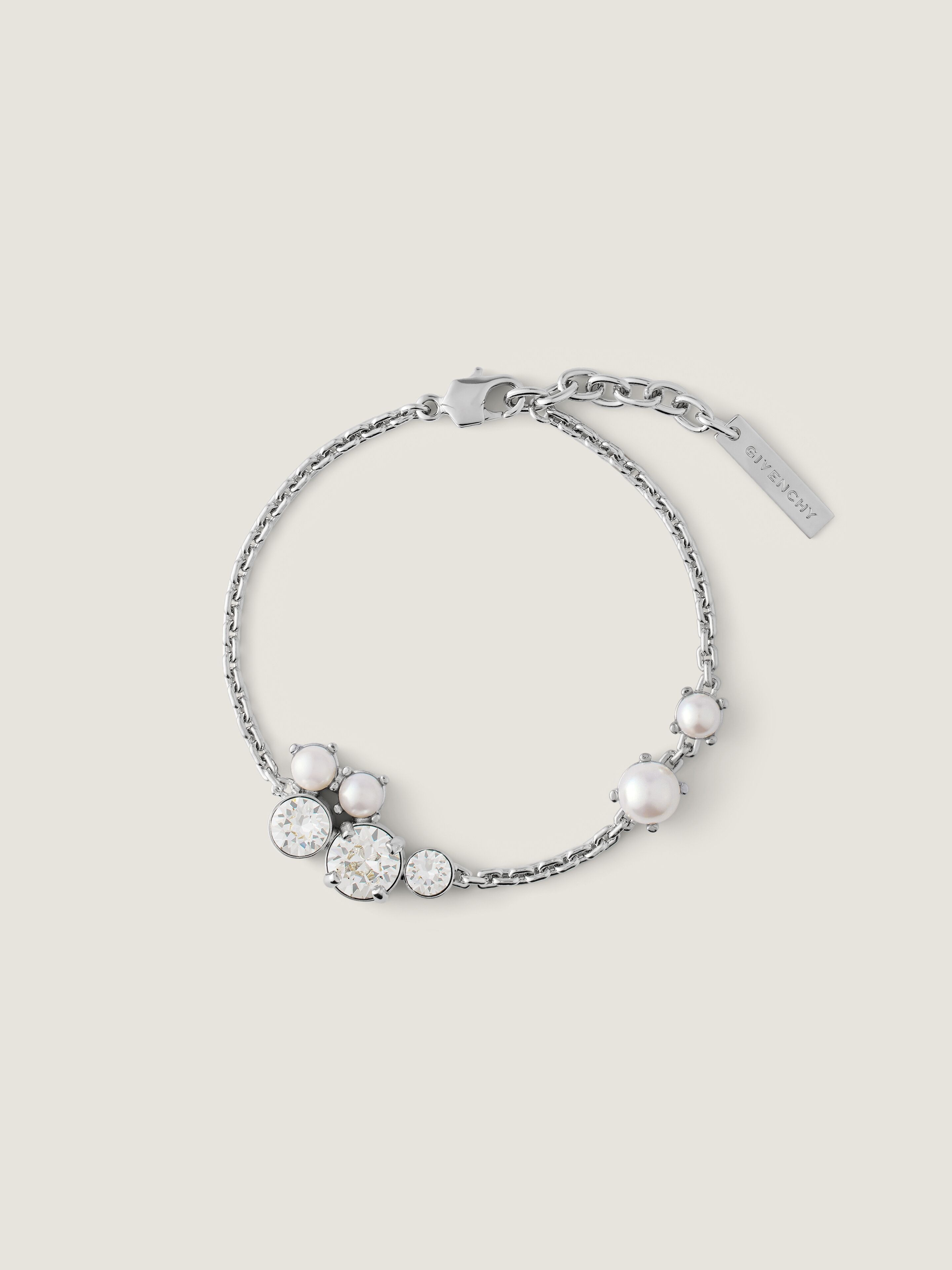 - Bracelet in silvery-finish metal with crystals and pearls. - Crystal Pearl line. - Adjustement chain with GIVENCHY engraved metal plaque. - Matching necklace, earrings and ring sold separately.
