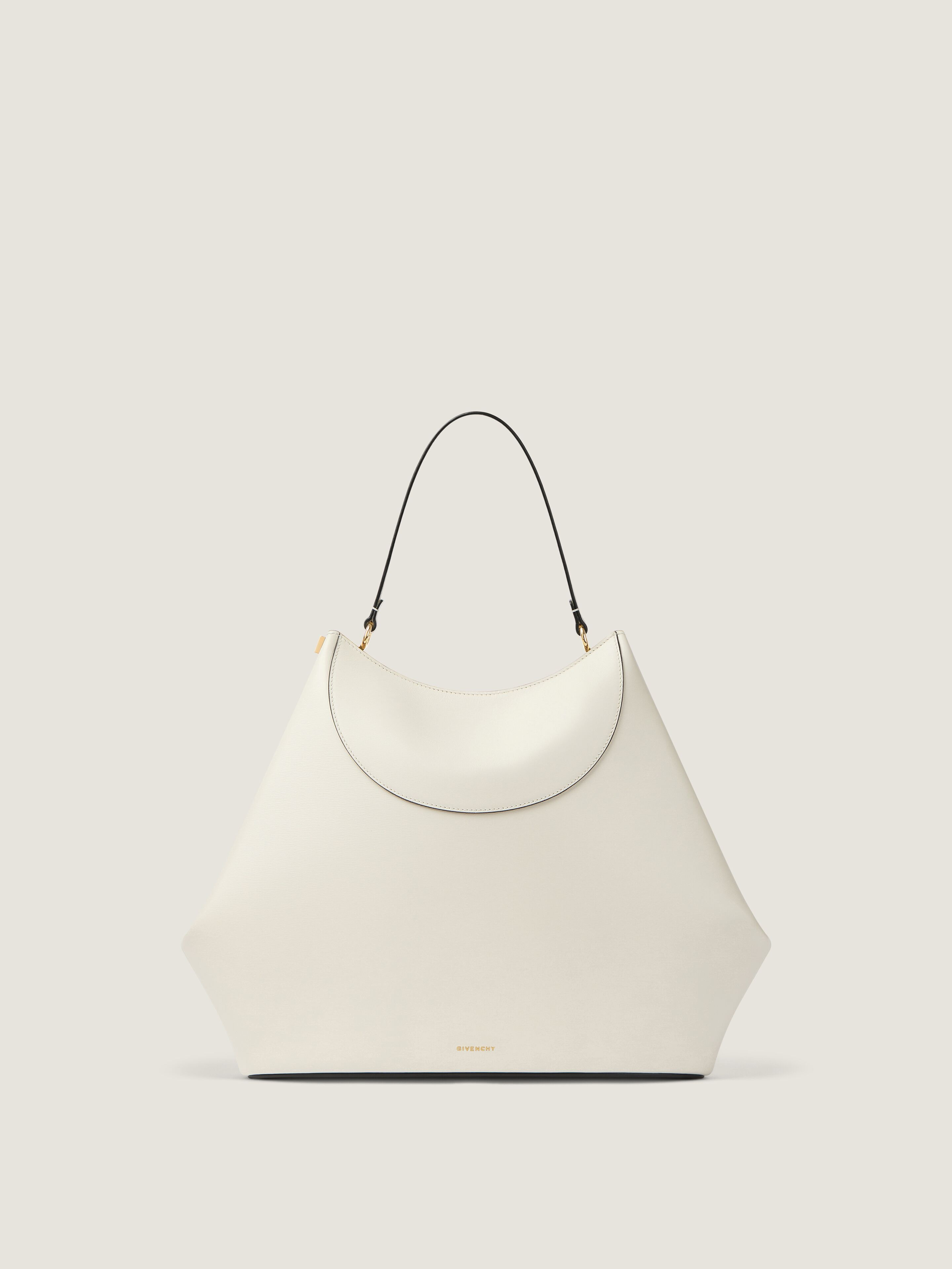 - Top handle bag in leather with natural grain and textured finishing. - Facet line. - Geometric shape and rounded edge construction molded in wood. - Functional metal hinge for easy opening and closing, engraved with GIVENCHY Paris signature. - Leather handle offering hand or shoulder carrying. - GIVENCHY signature embossed on the front and contrasting GIVENCHY Paris patch on the inside. - Contrasted hand made edges. - Leather side gussets. - One main compartment with one flat pocket inside. - Nappa lining.