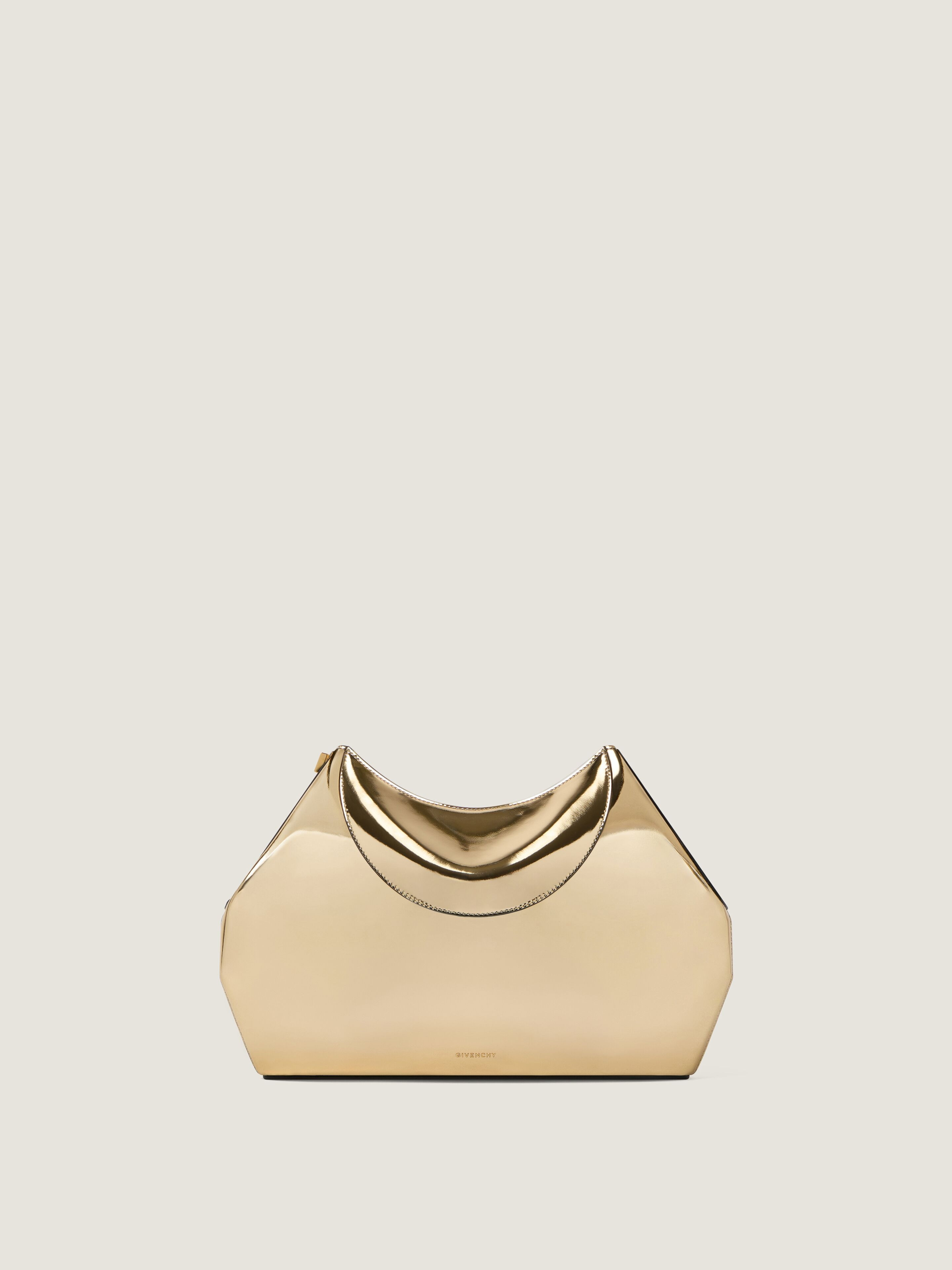 - Clutch in mirror effect leather. - Facet line. - Geometric shape and rounded edge construction molded in wood. - Functional metal hinge for easy opening and closing, engraved with GIVENCHY Paris signature. - GIVENCHY signature embossed on the front and contrasting GIVENCHY Paris patch on the inside. - Contrasted hand made edges. - One main compartment with one card slot inside. - Nappa lining. - Delicate leather, to preserve this item over time, we recommend you take the following precautions: - Keep the item away from heat sources. - Avoid any contact with greases, cosmetics or perfumes. - When the item is not in use, store it with care in its dust bag and in a cool, dry place. - Try not to let your bag rub against other objects as this may lead to damage or peel it.