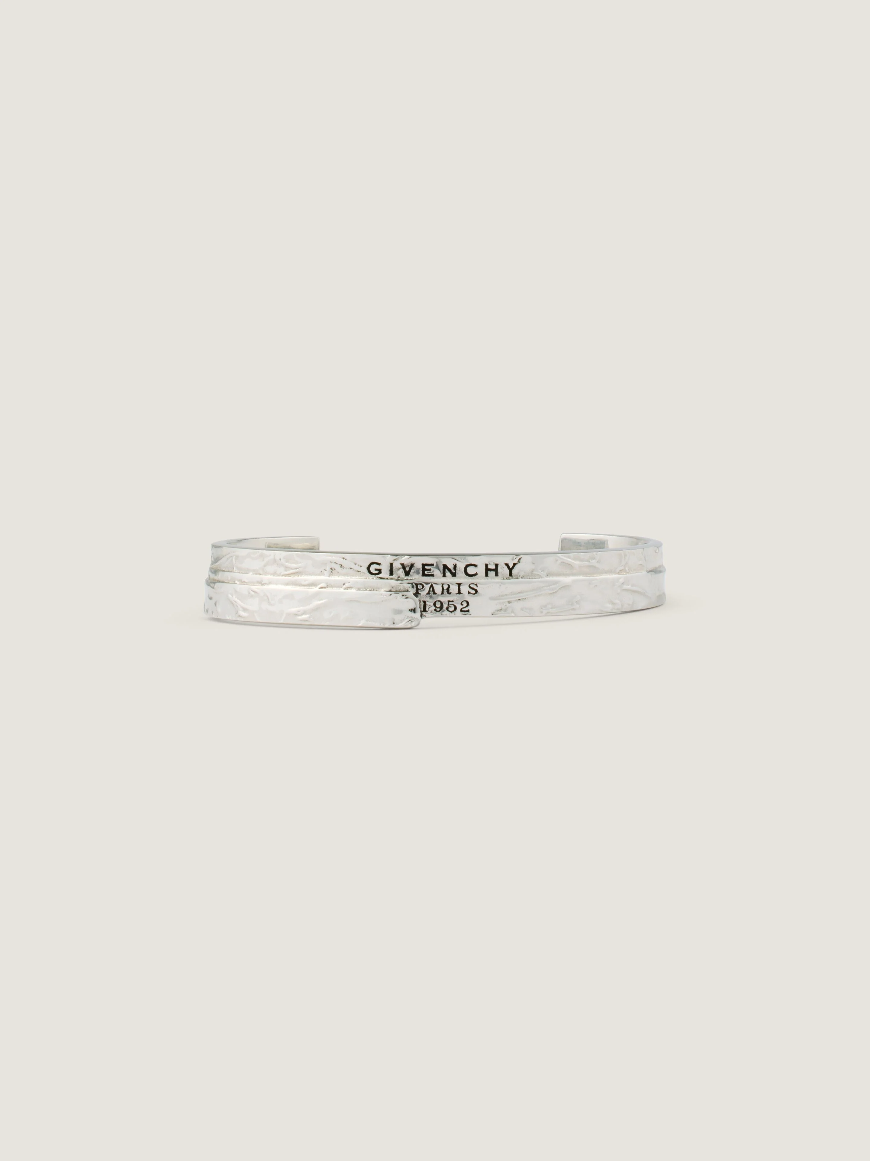 - Cuff bracelet in silvery-finish textured metal. - GIVENCHY Tape line. - GIVENCHY Paris 1952 in black enamel on the front. - GIVENCHY signature engraved on the inside. - Matching necklace, earrings, bracelet and earcuff sold separately.