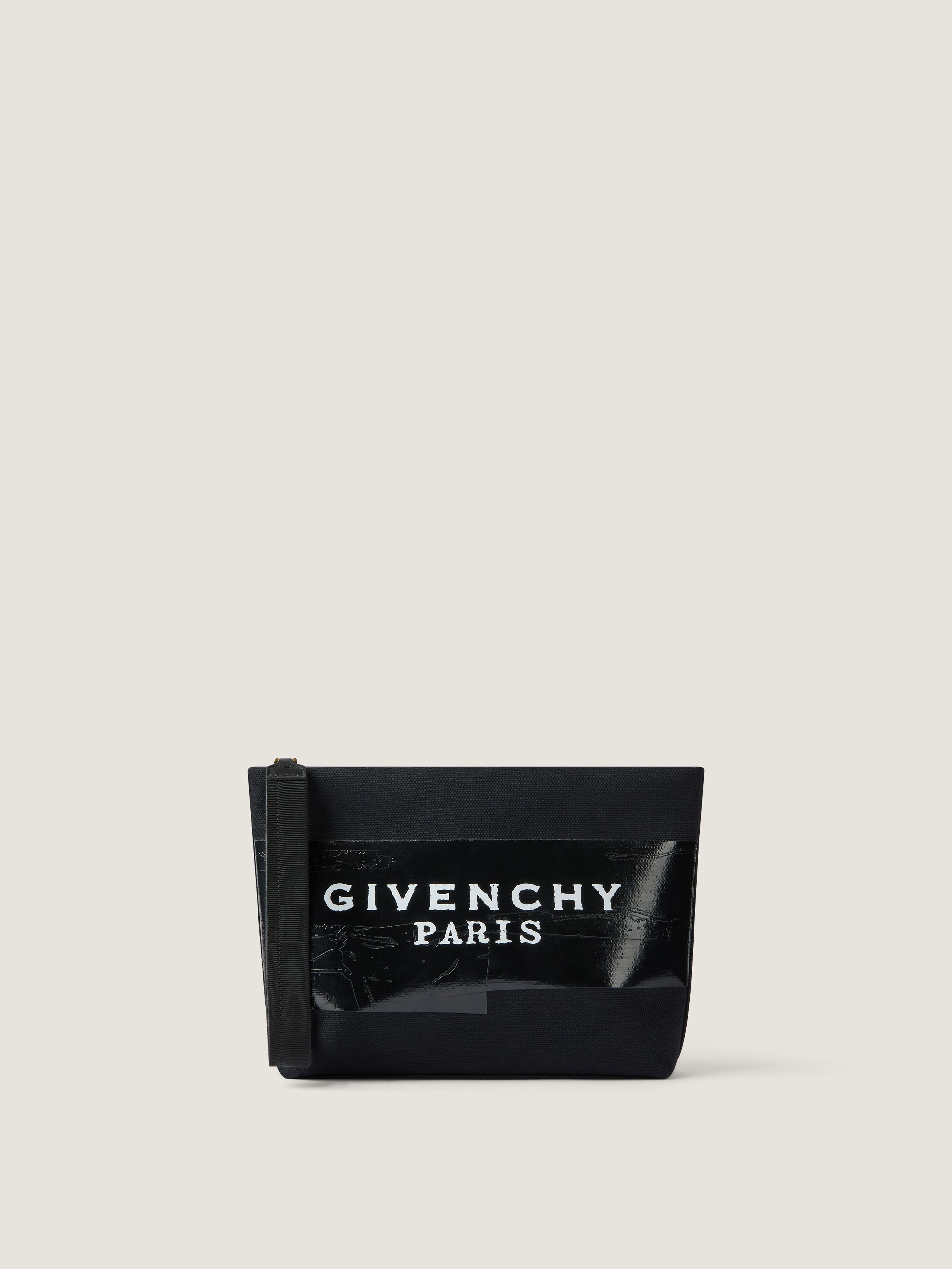 - Pouch in cotton canvas. - Zipped closure. - Gros grain strap with leather lining. - GIVENCHY Tape 3D print on the front. - GIVENCHY Paris patch on the inside. - One main compartment with one flat pocket inside.