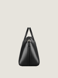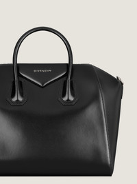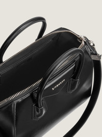 - Medium handbag or shoulder bag in Box calfskin leather. - Antigona line. - Zipper closure with GIVENCHY 4G zipper pull. - Pentagonal patch with silvery debossed GIVENCHY signature. - Leather handles. - Adjustable and removable strap in leather. - Silvery-finish metal details. - One main compartment with two flat pockets and one zippered pocket inside. - Strap length: 30 in. Handle: 3.1 in.