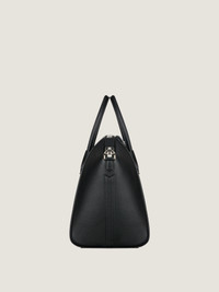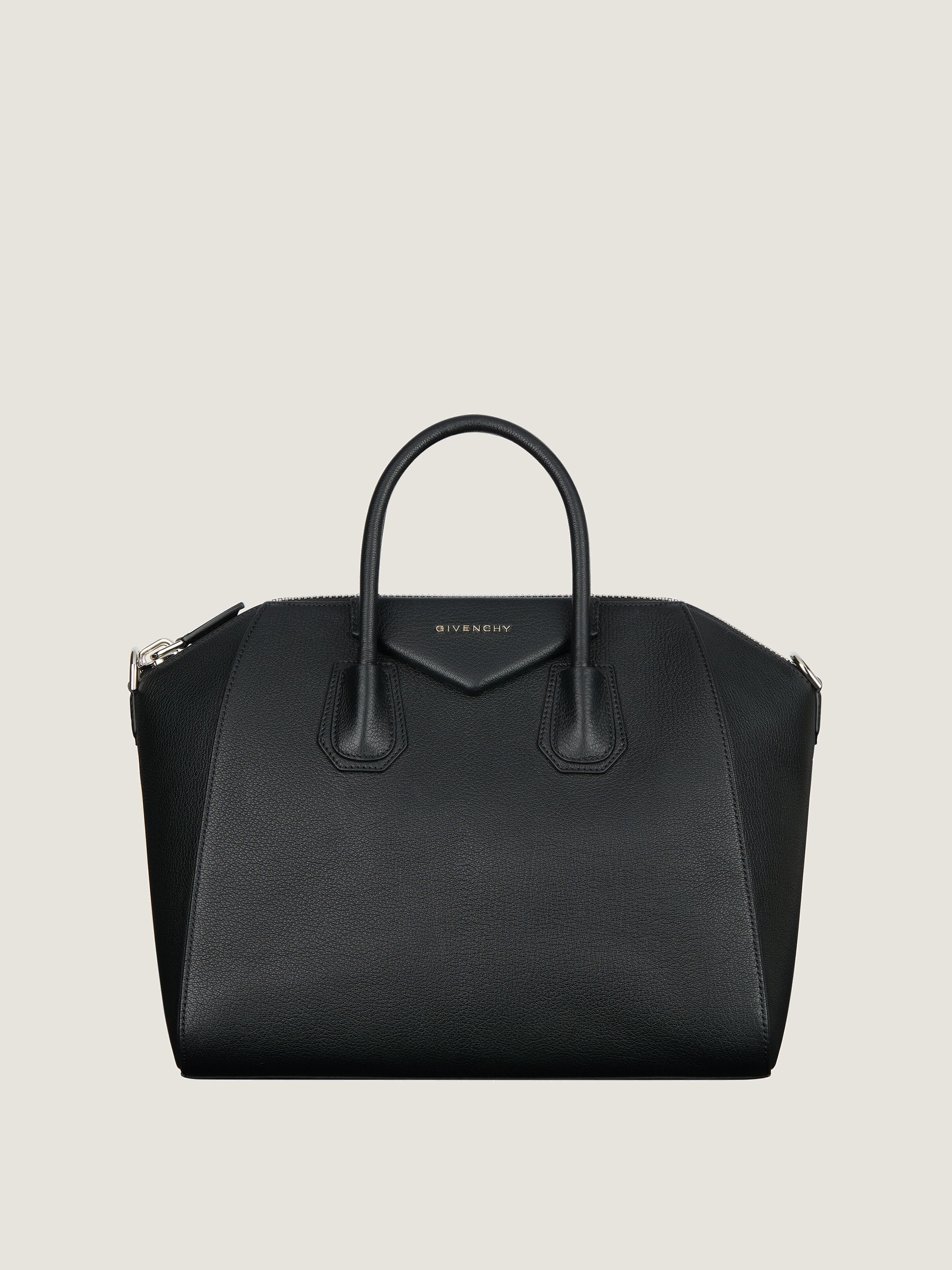 - Medium handbag or shoulder bag in grained goatskin leather. - Antigona line. - Zipper closure with GIVENCHY 4G zipper pull. - Pentagonal patch with silvery debossed GIVENCHY signature. - Leather handles. - Adjustable and removable strap in leather. - Silvery-finish metal details. - One main compartment with two flat pockets and one zippered pocket inside. - Strap length: 30 in. Handle: 3.1 in.
