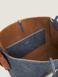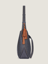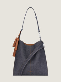 - Medium Hobo bag in denim with contrasting stitchings. - Belted line. - Inside laces to secure your belongings. - Adjustable strap offering shoulder carrying. - GIVENCHY signature embroidered on the front of the bag. - Denim belt adorning the front. - Decorative and removable leather tassel. - Silvery-finish metal details. - One main compartment and one flat pocket inside. - Suede lining.