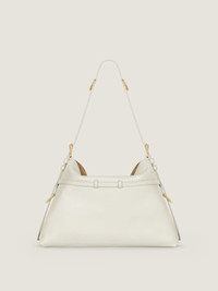 - Medium shoulder bag in elevated smooth and shiny calfskin leather. - Voyou line. - V-shaped slouchy silhouette and generous volume. - Adjustable shoulder strap offering hand, shoulder or crossbody carrying. - GIVENCHY signature embossed on the front of the bag and on the top of the shoulder bag. - Delicate GIVENCHY engraved metal buckles. - Golden-finish metal details. - One main compartment and one zipped pocket inside. - Suede lining.