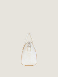 - Mini handbag or crossbody bag in tumbled calfskin leather aged by hand. - Antigona line. - Zipper closure with GIVENCHY 4G zipper pull. - Pentagonal patch with silvery debossed GIVENCHY signature. - Adjustable and removable leather shoulder strap. - Silvery-finish metal details. - One zippered pocket inside. - Shoulder strap length: 19 in. Handle: 3 in.