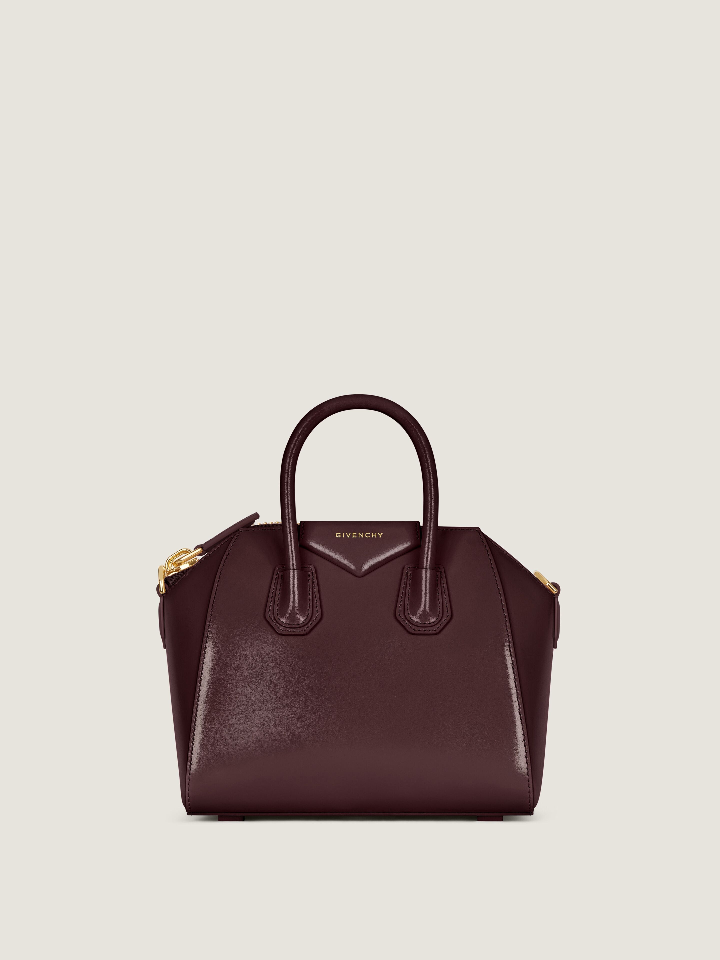 - Mini handbag or crossbody bag in Box calfskin leather. - Antigona line. - Zipped closure. - Leather handles. - Adjustable and removable leather shoulder strap. - Pentagonal patch with golden embossed GIVENCHY signature. - Golden-finish metal details. - One main compartment with two flat pockets and one zippered pocket inside.
