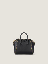 - Mini bag in Box calfskin leather with studs. - Antigona line. - Zipped closure. - Hand or crossbody carrying. - Leather handles. - Adjustable and removable leather shoulder strap. - Pentagonal patch with golden embossed GIVENCHY signature. - Golden-finish metal details. - One main compartment with two flat pockets and one zippered pocket inside.