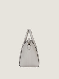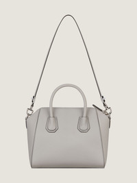 - Mini handbag or shoulder bag in grained goatskin leather. - Antigona line. - Zipper closure with GIVENCHY 4G zipper pull. - Pentagonal patch with silvery debossed GIVENCHY signature. - Leather handles. - Adjustable and removable strap in leather. - Silvery-finish metal details. - One zippered pocket inside. - Shoulder strap length: 29.5 in. Handle: 3.9 in.