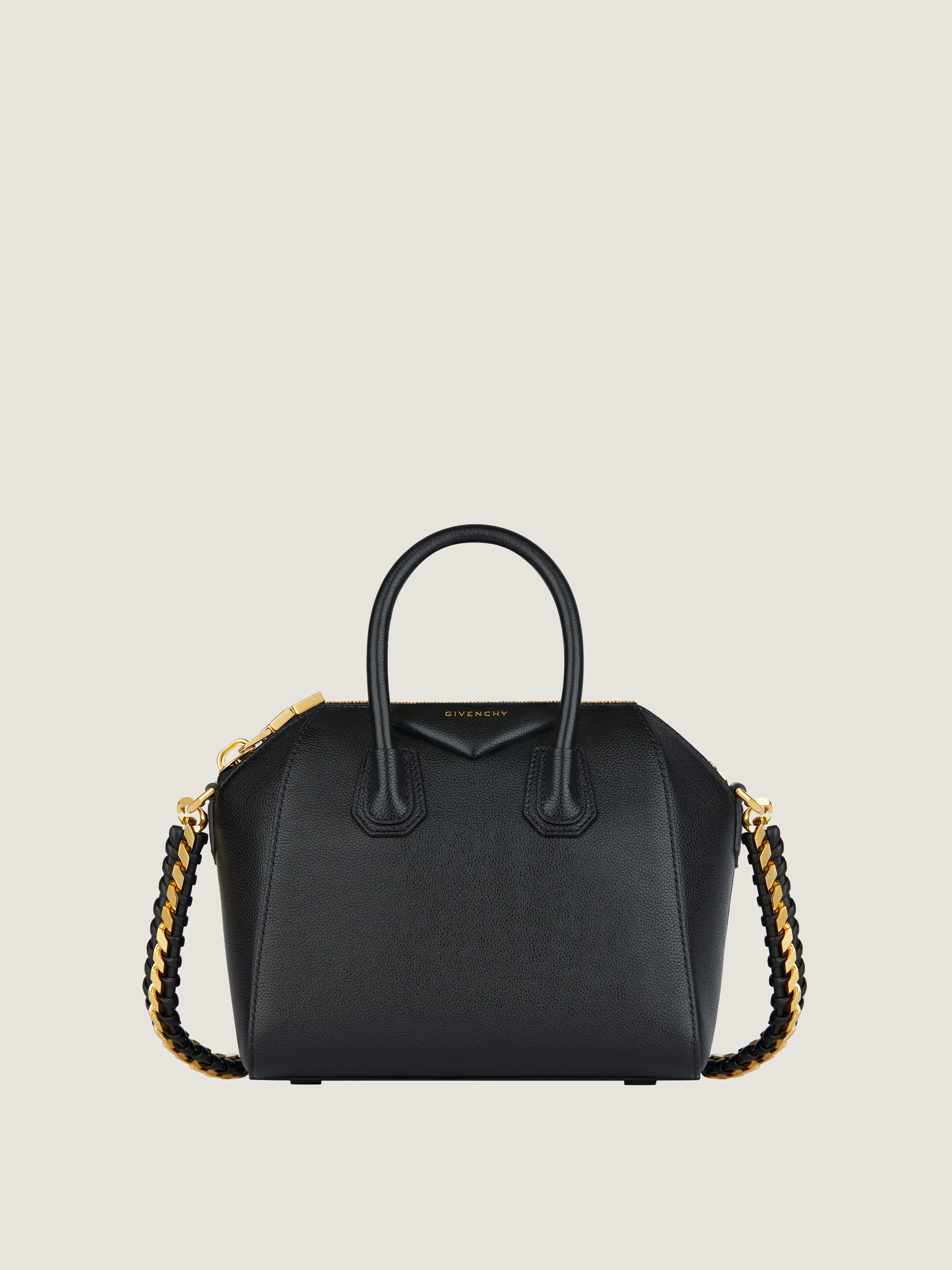 - Mini handbag or crossbody bag in grained calfskin leather. - Antigona line. - Zipper closure with GIVENCHY 4G zipper pull. - Pentagonal patch with golden debossed GIVENCHY signature. - Leather handles. - Removable strap in metal-braided leather and leather. - Golden-finish metal details. - One zippered pocket inside. - Strap length: 19 in. Handle: 3 in.