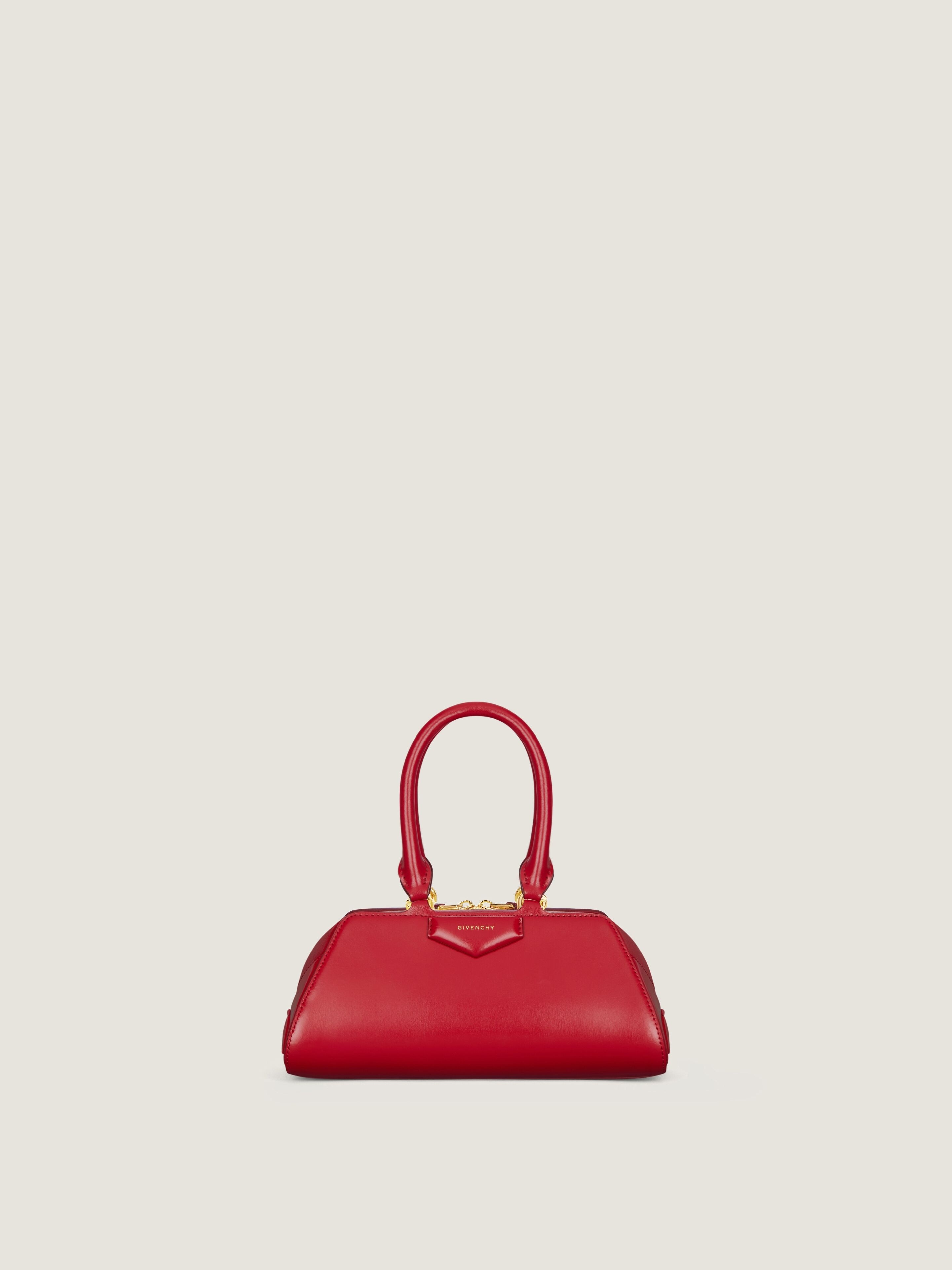 - Mini handbag or crossbody bag in Box calfskin leather and shiny grained leather. - Antigona Cube line. - Long East-West shape with origami-style gusset construction. - Zipped closure. - Articulated leather handles with four D-Rings for the shoulder strap. - Adjustable and removable leather shoulder strap. - Pentagonal patch with embossed GIVENCHY signature on the front. - Golden-finish metal details. - One main compartment.