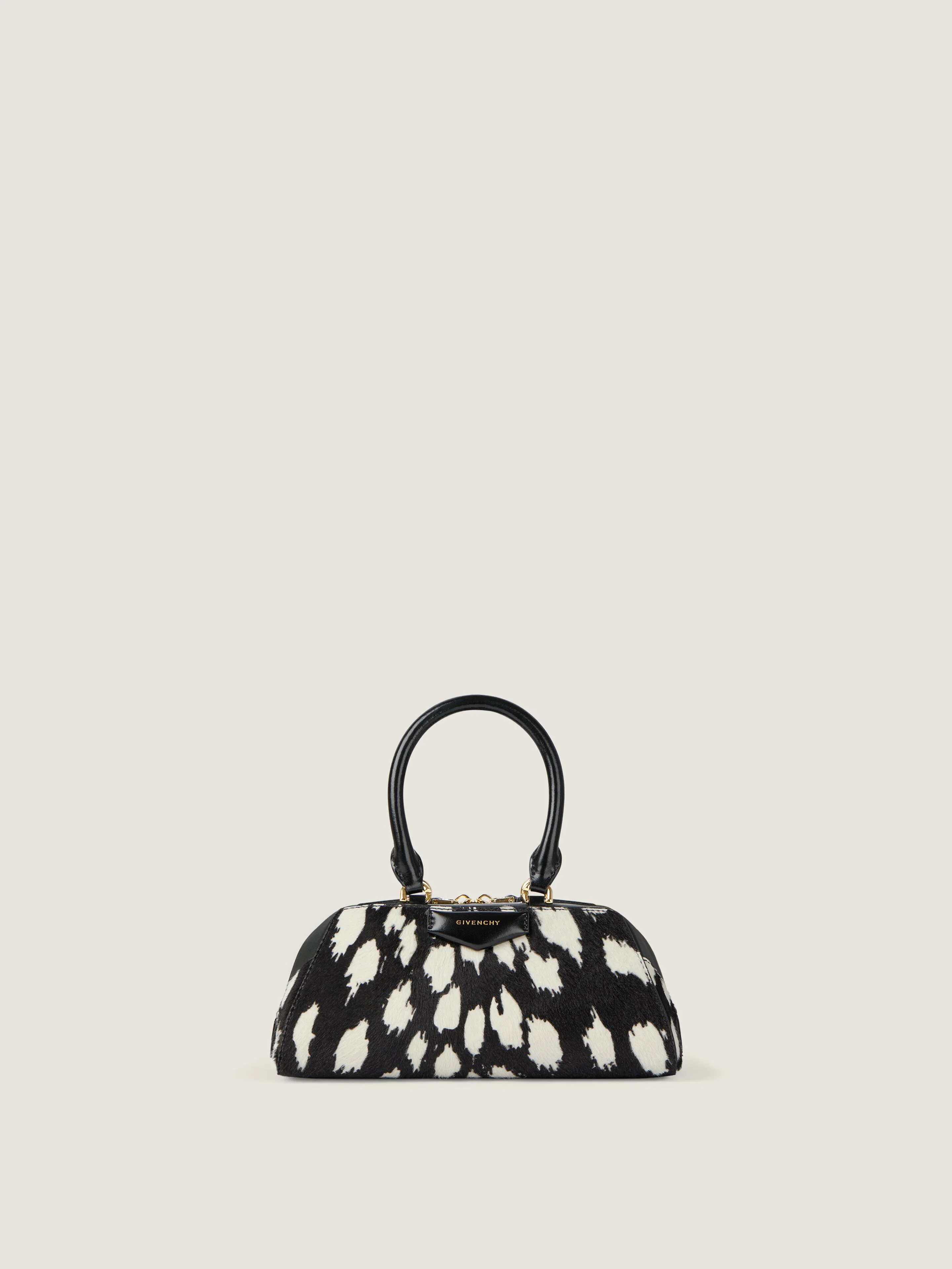 - Mini bag in pony effect calfskin leather with snow leopard pattern. - Antigona line. - Long East-West shape with origami-style gusset construction. - Zipped closure. - Hand or crossbody carrying. - Articulated leather handles with four D-Rings for the shoulder strap. - Adjustable and removable leather shoulder strap. - Pentagonal patch with embossed GIVENCHY signature on the front. - GIVENCHY Paris patch on the inside. - Golden-finish metal details. - One main compartment. - Each bag is unique and the print may differ from one model to another.