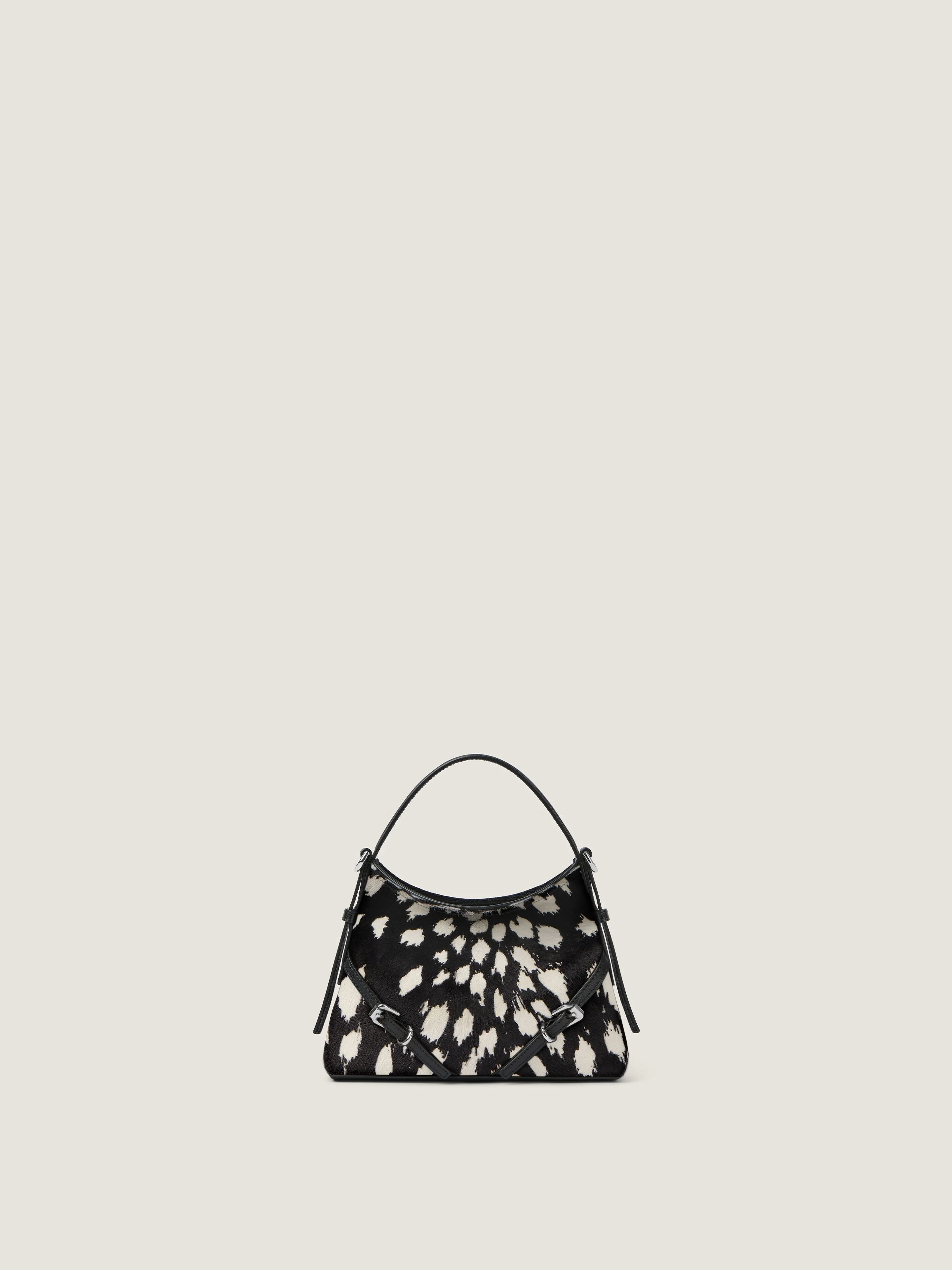 - Nano handbag bag in pony effect calfskin leather with snow leopard pattern. - Voyou line. - Short leather handle with golden GIVENCHY signature. - Thin removable leather strap offering crossbody carrying. - GIVENCHY engraved metal buckles. - Golden-finish metal details. - One main compartment. - Canvas lining. - Each bag is unique and the print may differ from one model to another.
