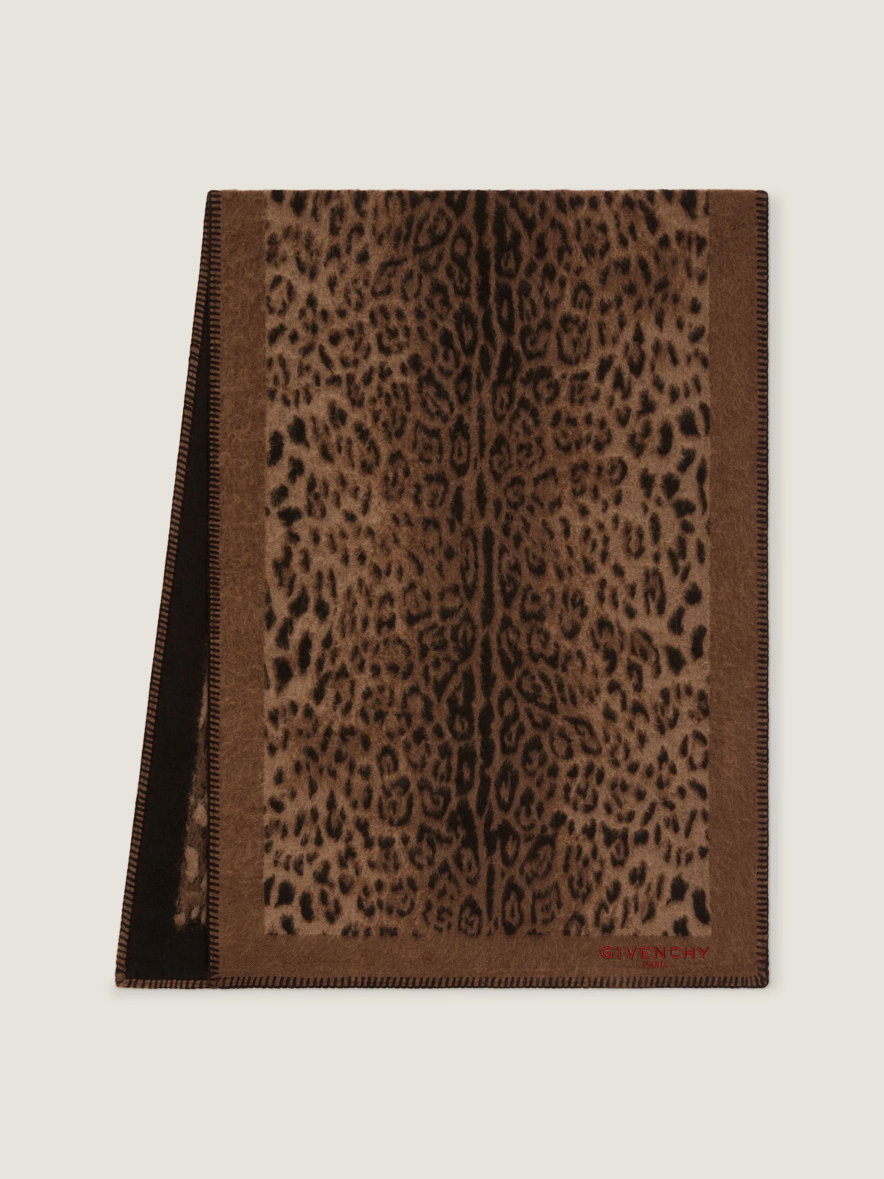 - Fluffy scarf in wool jacquard. - Leopard print. - Contrasting GIVENCHY Paris signature embroidered on the bottom. - Stitched edges.