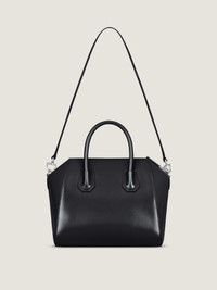 - Small bag in Box calfskin leather. - Antigona line. - Zipped closure. - Hand or shoulder carrying. - Leather handles. - Adjustable and removable leather shoulder strap. - Pentagonal patch with silver embossed GIVENCHY signature. - Silvery-finish metal details. - One main compartment with two flat pockets and one zippered pocket inside.