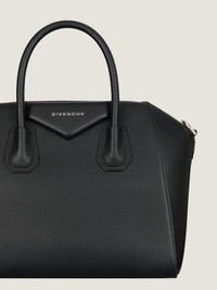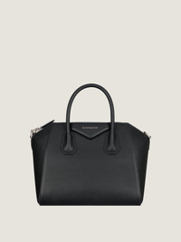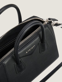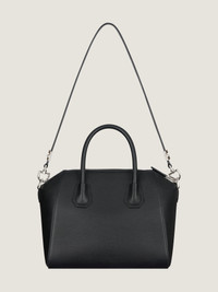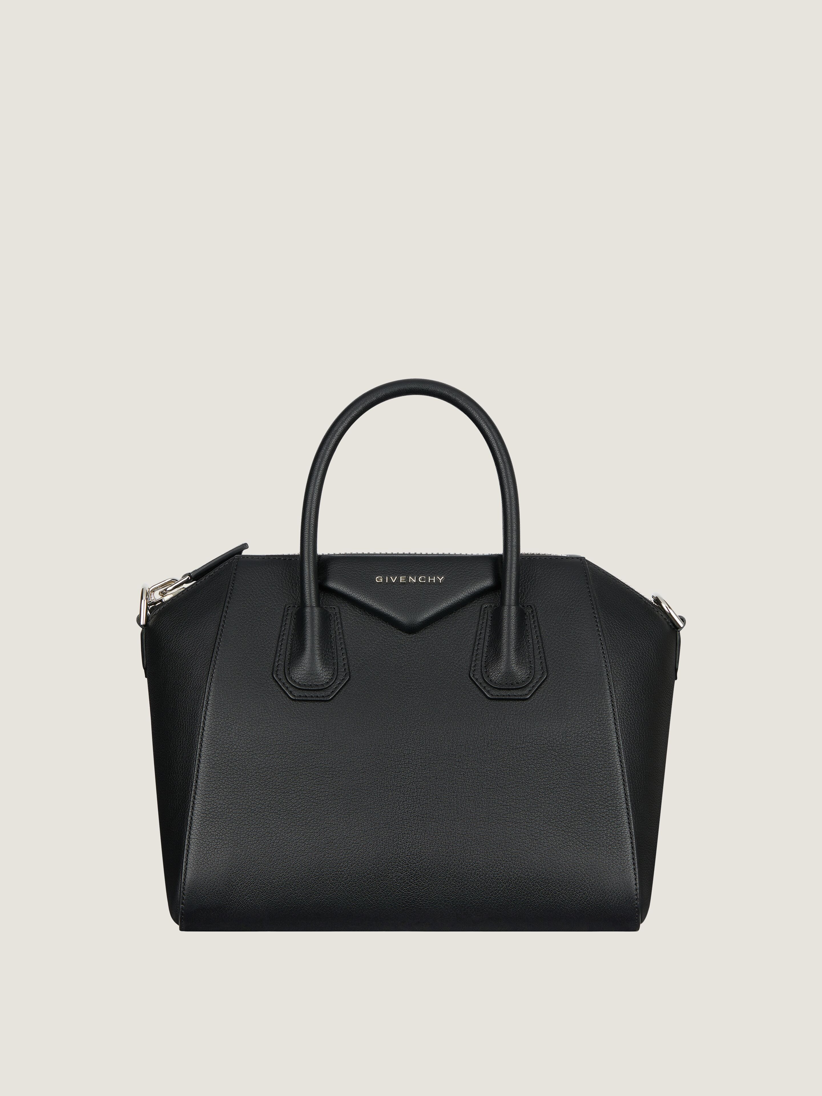 - Small handbag or shoulder bag in grained goatskin leather. - Antigona line. - Zipper closure with GIVENCHY 4G zipper pull. - Pentagonal patch with silvery debossed GIVENCHY signature. - Leather handles. - Adjustable and removable strap in leather. - Silvery-finish metal details. - One zippered pocket inside. - Shoulder strap length: 29.5 in. Handle: 3.9 in.