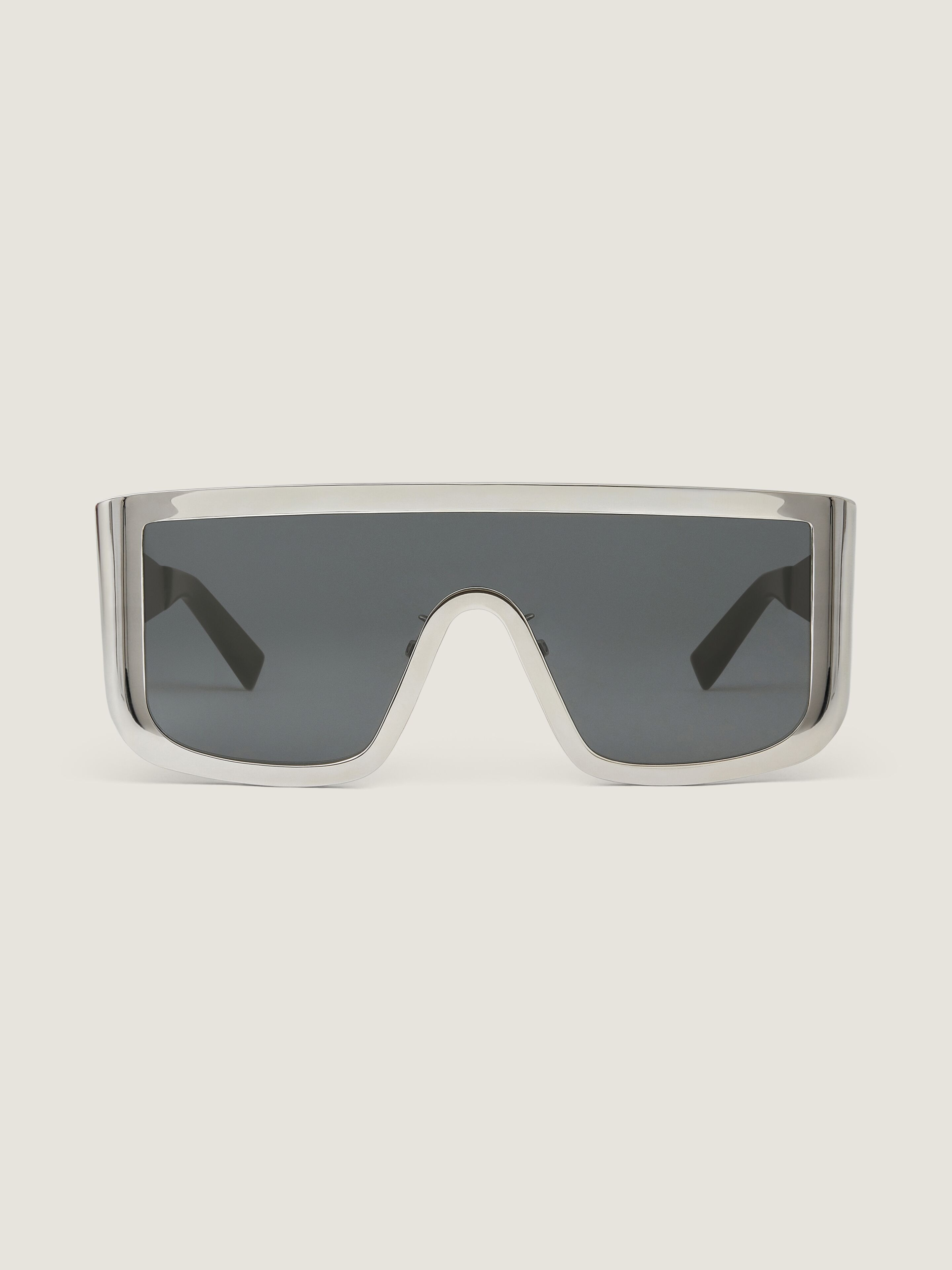 - Sunglasses in metal. - Square line. - Mask shape. - Smoke lenses. - Adjustable nose pads. - GIVENCHY signature engraved on the temples. - Acetate end-tips for comfort. - 100% UVA/UVB protection. - Weight: 65g. - Model comes in a case.