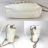 Pre-Owned 100% Authentic Fall-Winter 2025/26 Pre-Collection Chanel 22 Mini Shiny Calfskin Quilted White Crossbody Hand Bag RATING: A...excellent, near mint, has little to no signs of wear MATERIAL: calfskin leather, nylon STRAP: leather woven into metal and white thin leather strap that can be put together or seperated into bag DROP: 21'' HANDLE: adjustable (by pulling it closed) double leather woven into golden metal DROP: 6.5 COLOR: white CLOSURE: drawstring EXTERIOR: excellent ODOR: no HARDWARE: golden-tone INTERIOR: tan nylon, mint DATE CODE: TTHT8HUJ MEASUREMENTS: H 7.5'' x L 7'' x W 2.5'' INCLUDED: *Chanel dust bag*Chanel booklet Please see all pictures to determine final condition, pictures are of actual item ! SHIPPING: will ship same day or next day SKU B789 0725