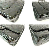 Pre-Owned 100% Authentic Chanel 2.55 Reissue Double Flap Iridescent Dark Green Patent Leather Shoulder Bag RATING: B...Very Good, well maintained, shows minor signs of wear MATERIAL: patent leather HANDLE: sliding antique silver chain link DROP: single 18'' double 11'' COLOR: dark green, shade of Olive CLOSURE: push, turn lock EXTERIOR: tiny faint bend line across bottom in front, faint scuff marks (upon close inspection) ODOR: no HARDWARE: antique silver, faint scratches INTERIOR: green leather, has wrinkle across were it closes black flap has some indents from hardware on both sides and few other faint scratch lines DATE CODE: 15649817 YEAR: 2011-2012 MEASUREMENTS: H 7.7'' x L 12.5'' x W 3.2'' Please see all pictures to determine final condition, pictures are of actual item ! SHIPPING: will ship same day or next day SKU C567 0925