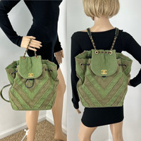 Pre-Owned 100% Authentic CHANEL Cruise Coco Cuba Collection Chevron Patchwork Khaki Green Backpack RATING: A/B...Very Good, well maintained, shows minor signs of wear MATERIAL: canvas, leather STRAPS: adjustable canvas and leather adjustable up to 4'' leather on strap is excellent HANDLE: single leather threaded through chain, leather is new and was replaced by Chanel LEATHER: black leather is new and was replaced by Chanel(receipt included) DROP: 4'' COLOR: khaki, green EXTERIOR: very good, tiny whitish line on corners ODOR: no HARDWARE: Antique golden, faint scratches, tiny tiny fading INTERIOR: pink canvas, very clean AUTHENTICITY CODE: 23606885 YEAR: 2017 MEASUREMENTS: H 13'' x L 10'' x W 7'' INCLUDED: *Chanel Authenticity Card*Pink felt insert to help keep structured SHIPPING: will ship same day or next day Please see all pictures to determine final condition, pictures are of actual item ! SKU B489 0222-D