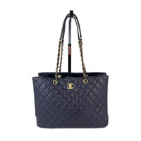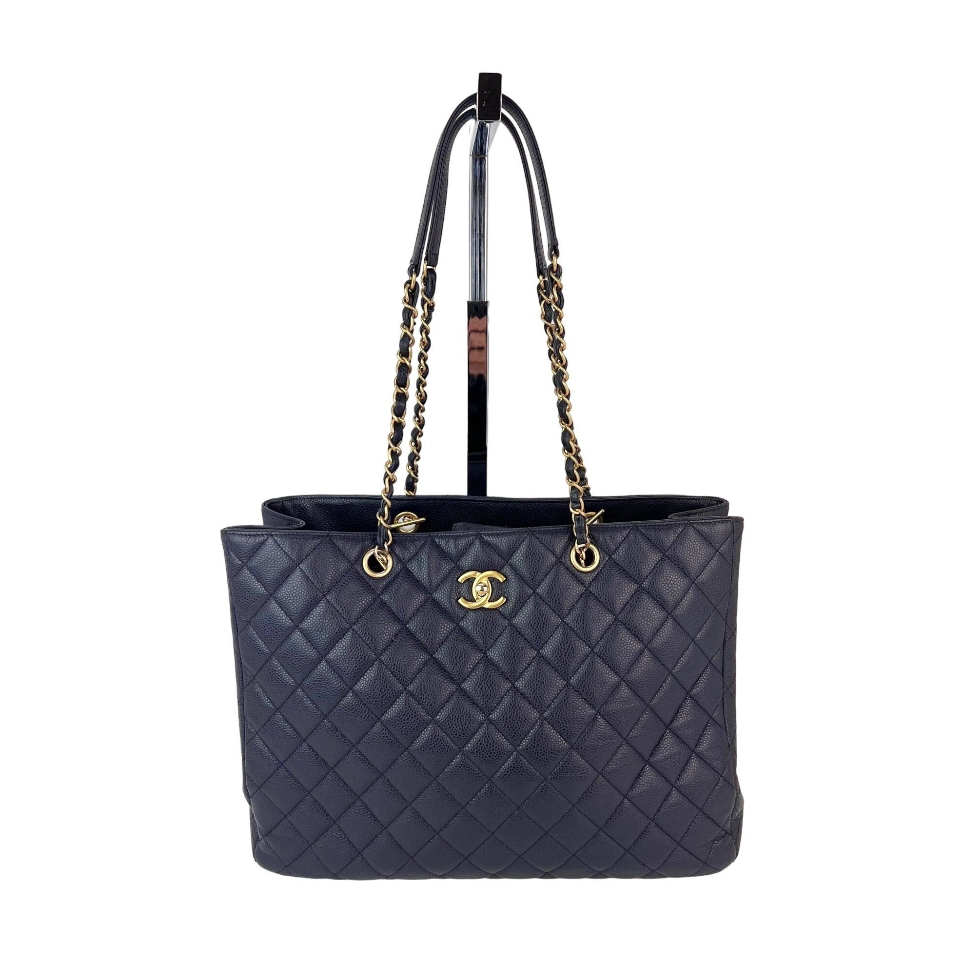 Pre-Owned 100% Authentic Chanel Caviar Quilted Large Classic Shopping Blue Leather Tote RATING: B...Very Good, well maintained, shows minor signs of wear MATERIAL: caviar leather HANDLE: double leather woven in chain DROP: 10.5'' COLOR: dark blue, navy CLOSURE: toggle EXTERIOR: sides has a little bend near bottom ODOR: no HARDWARE: antique golden, little faint wear on hardware INTERIOR: blue nylon, clean DATE CODE: 21953297 MEASUREMENTS: H 11'' x L 14'' x W 4'' Please see all pictures to determine final condition, pictures are of actual item ! SHIPPING: will ship same day or next day SKU C410 0824