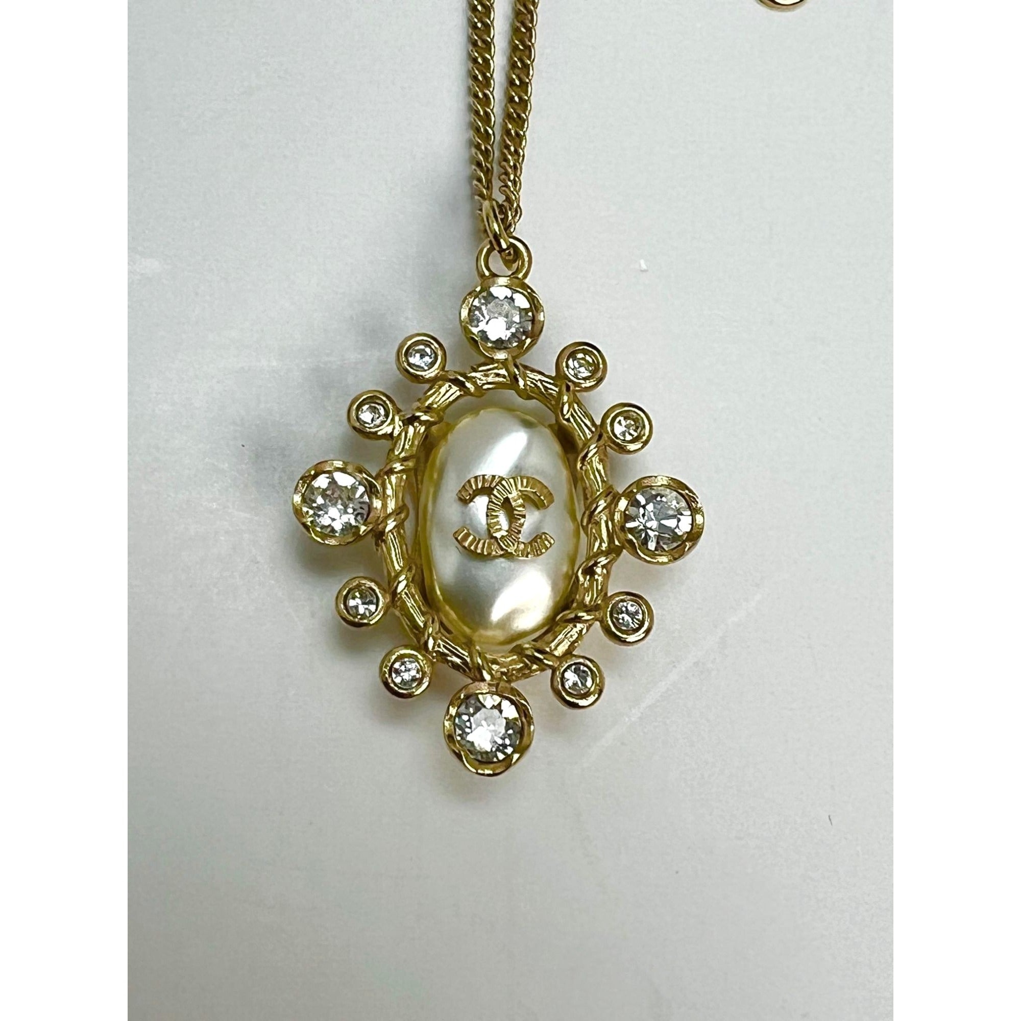 Preowned 100% Authentic Chanel Crystal CC Necklace Gold Pearly Fashion Jewelry RATING: A...near mint, shows little to no signs of wear CONDITION: excellent MATERIAL: metal, crystals, pearly LENGTH: 24'' long has a second adjustment 8'' drop ATTACHED CHARMS: MEASUREMENTS: 24'' long INCLUDED: *Chanel Box*Chanel Dust bag*Chanel tag Please See All Pictures, They Are Of Actual Item! SKU C276 0923