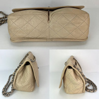 Pre-Owned 100% Authentic Chanel Grained leather Medium Natural Beauty Beige Flap Bag RATING: B-... Good, shows some signs of wear MATERIAL: calfskin leather STRAP: sliding strap leather woven in chain , some leather pieces have some marks on them DROP: single 20'' double 11.5'' COLOR: beige CLOSURE: turn toggle EXTERIOR: corners have little scuffing ODOR: no HARDWARE: silver, minimal scratches INTERIOR: green canvas, has pen marks in front 2 pockets and little inside bigger section, pen line on inside flap, couple pen dots under flap next to toggle each side DATE CODE: 20522680 MEASUREMENTS: H 7.7'' x L 12'' x W 4'' INCLUDED: *Chanel Auth Card Please see all pictures to determine final condition, pictures are of actual item ! SHIPPING: will ship same day or next day SKU B687 0524