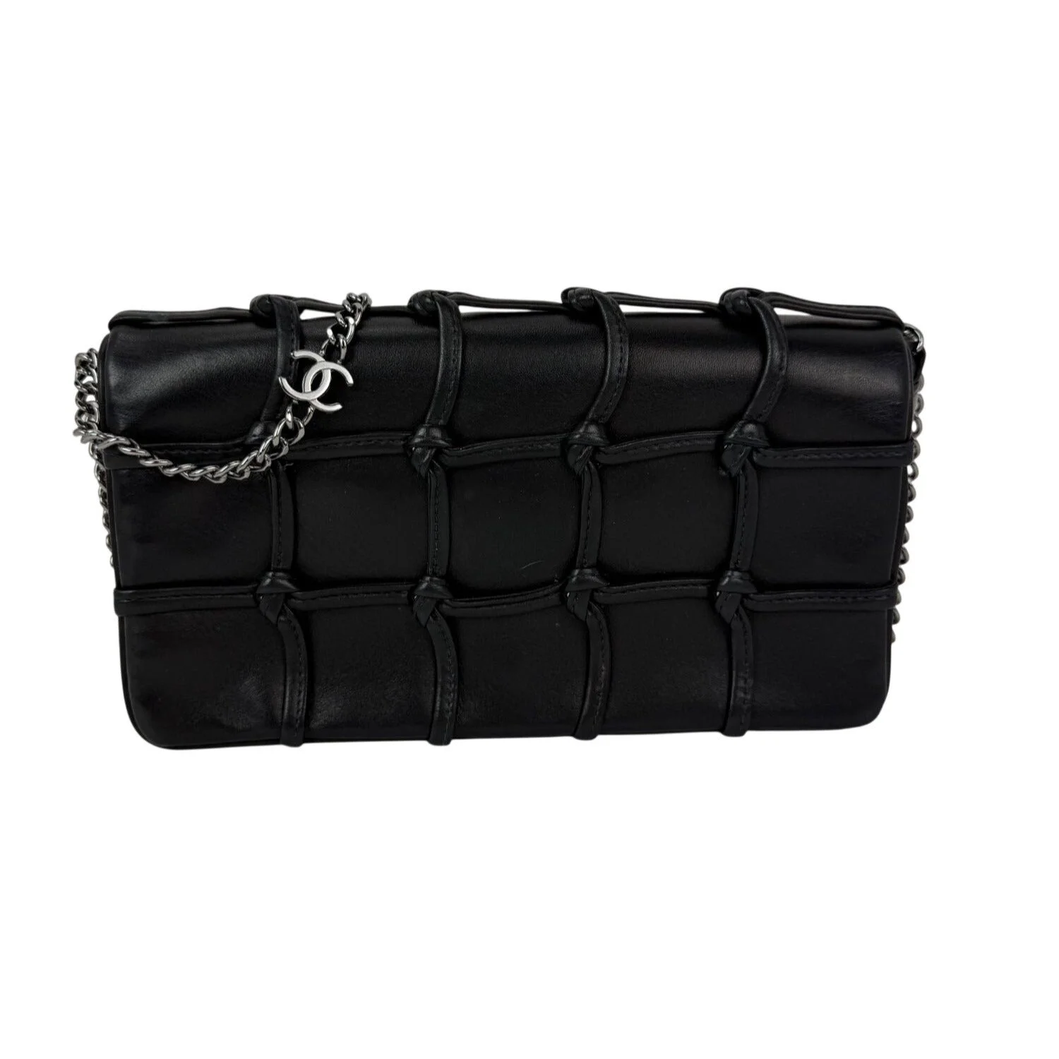 Pre-Owned 100% Authentic Chanel Lambskin Cruiser Quilted Knot Flap Bag RATING: B+...Very Good, well maintained, shows minor signs of wear MATERIAL: lambskin HANDLE: metal and double leather straps DROP: 14'' COLOR: black CLOSURE: magnetic snap EXTERIOR: on top piping has a tiny bit of rubbing (have to really look for it) few faint faint indent lines front and back ODOR: no HARDWARE: glossy ruthenium INTERIOR: black nylon, very clean, leather few faint faint scuff lines DATE CODE: 9060663 YEAR: 2005-2005 MEASUREMENTS: H 5'' x L 9.2'' x W 2'' INCLUDED: *Chanel auth card Please see all pictures to determine final condition, pictures are of actual item ! SHIPPING: will ship same day or next day SKU C610 0126