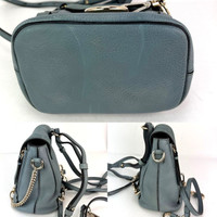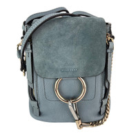 Pre-Owned 100% Authentic Chloe Blue Faye Mini Suede and Leather Backpack Bag RATING: B...Very Good, well maintained, shows minor signs of wear MATERIAL: suede, calfskin leather STRAP: 2 adjustable removable leather, little wrinkling on 1 strap DROP: longest 16'' HANDLE: *Chloe strap removable leather 20'' long DROP: 7 in COLOR: blue faye, blueish gray CLOSURE: magnetic EXTERIOR: couple indent lines on bottom, couple scuff lines on back ODOR: no HARDWARE: silver and gold some protective coating on pieces INTERIOR: beige canvas, small roundish stain on bottom, scuff lines under flap DATE CODE: 03 17 75 65 MEASUREMENTS: H 7'' x L 7'' x W 4'' INCLUDED: *Chloe dust bag*Chloe booklet w/ auth card *Chloe strap removable leather 20'' long Please see all pictures to determine final condition, pictures are of actual item ! SHIPPING: will ship same day or next day SKU C414 0824
