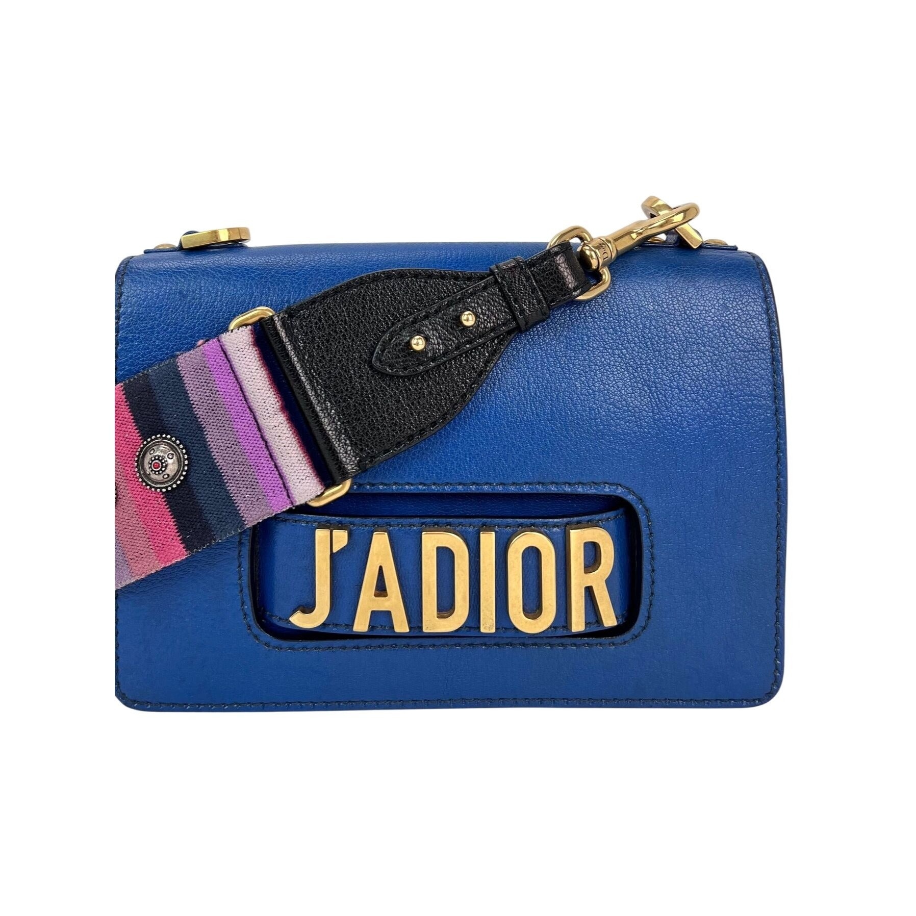 Pre-Owned 100% Authentic Christian Dior CD J'ADIOR Blue Flap Leather Shoulder Bag RATING: B...Very Good, well maintained, shows minor signs of wear MATERIAL: calfskin, canvas STRAP: multicolor Dior removable canvas leather strap 37'' long DROP: 18.5'' COLOR: blue, multicolor strap CLOSURE: magnetic EXTERIOR: faint scuff lines on back, bottom has some wrinkles ODOR: no HARDWARE: antique golden, some scratches INTERIOR: blue suede DATE CODE: 09 MA 0138 MEASUREMENTS: H 7'' x L 10'' x W 2'' INCLUDED: *Dior removable canvas leather strap 37'' long Please see all pictures to determine final condition, pictures are of actual item ! SHIPPING: will ship same day or next day SKU B771 0425-D