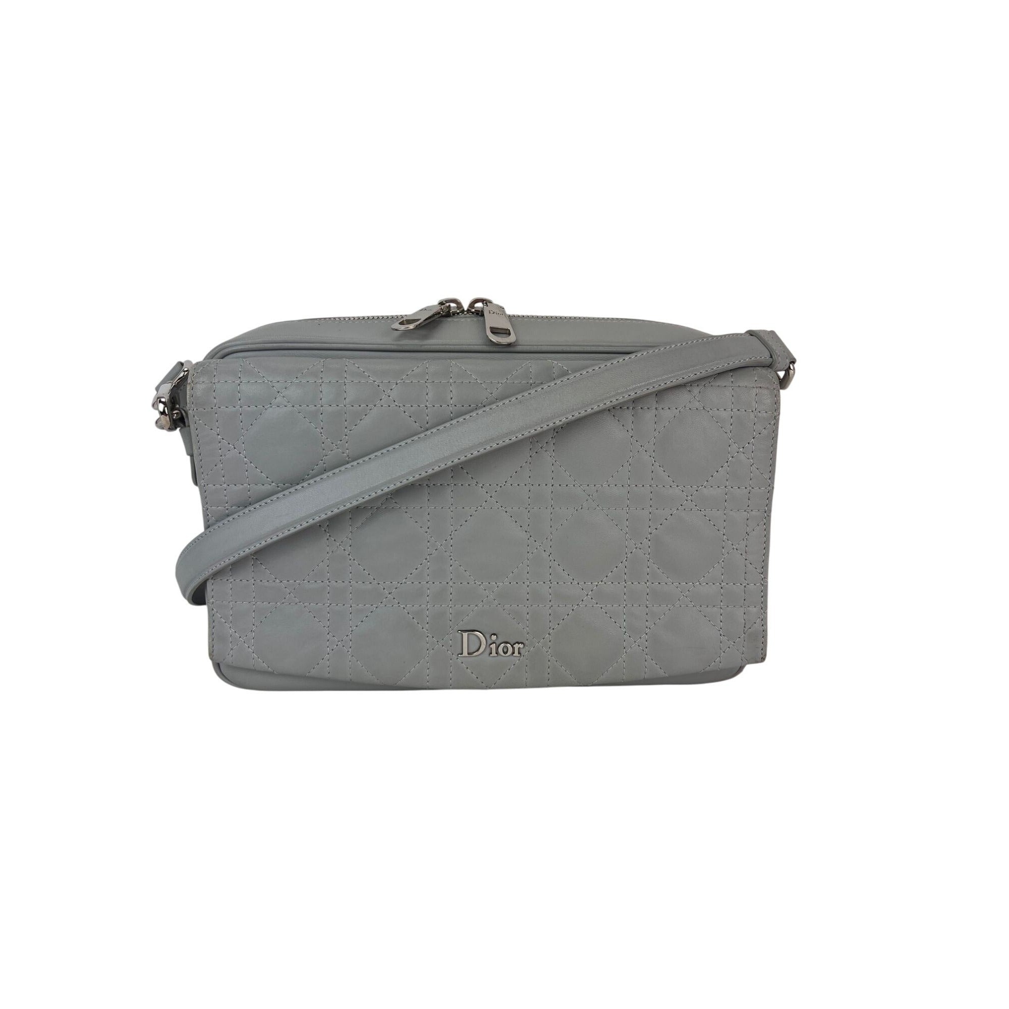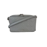 Pre-Owned 100% Authentic Christian Dior Lambskin Cannage Stardust Small Camera Crossbody Bag RATING: B...Very Good, well maintained, shows minor signs of wear MATERIAL: lambskin STRAP: Dior Gray leather removable adjustable strap 44.5'' to 48'' long DROP: 19'' to 22'' COLOR: gray CLOSURE: zipper EXTERIOR: has a front snap pocket with 4 slots >>4 corners tiny faint black mark, back has little faint black scuffing near piping on top and bottom ODOR: no HARDWARE: silver, minimal scratches INTERIOR: pink canvas, 1 zippered pocket, 1 open pocket. has some faint stain marks across top under zipper both sides DATE CODE: 12 B0 0156 MEASUREMENTS: H 6.6'' x L 10'' x W 2.7'' INCLUDED: *Dior Gray leather removable adjustable strap 44.5'' to 48'' long Please see all pictures to determine final condition, pictures are of actual item ! SHIPPING: will ship same day or next day SKU C530 0525