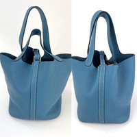 Pre-Owned 100% Authentic Hermes Taurillon Clemence Picotin 22 MM Blue Leather Hand Bag . This chic tote is crafted of textured clemence calfskin leather in blue. This bucket style bag features a unique one piece reinforced design with leather top handles and a closure strap. This opens to a spacious blue suede interior with a textured leather base. This style does Not have a Lock RATING: B...Very Good, well maintained, shows minor signs of wear MATERIAL: taurilon leather HANDLE: double handle DROP: 6.7'' COLOR: Blue jean, Blue CLOSURE: pull through hardware EXTERIOR: tiny rubbing on corners ODOR: no HARDWARE: silver, bottom studs have some scratches INTERIOR: blue leather, has few pen marks in small bunch on 1 side(see pict) DATE CODE: C 0 Square L MEASUREMENTS: H 8.5'' x L 9.2'' x W 7'' Please see all pictures to determine final condition, pictures are of actual item ! SHIPPING: will ship same day or next day SKU B764 0325-D
